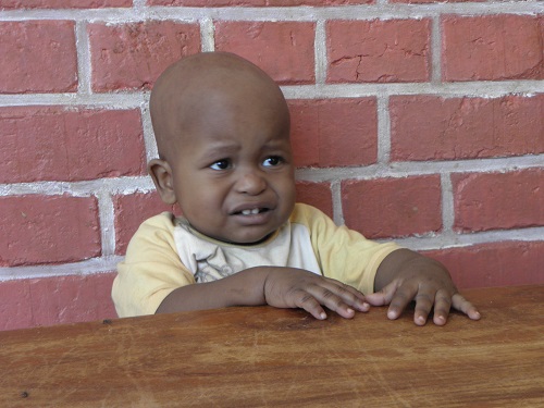 Nachdem er zunächst 3 Jahre in einem Behindertenheim in Dar gelebt hat haben ihn seine Eltern zurückgeholt. Sie haben in Deutschland von Martina Kriegbaum, einer Physiotherapeutin in Frammersbach, einen Behandlungsplan bekommen, den sie seither täglich durchführen. Als ich angekommen bin saß er inmitten seiner Geschwister und Freunden, es fällt auf den ersten Blick überhaupt nicht mehr auf, dass er körperbehindert ist.