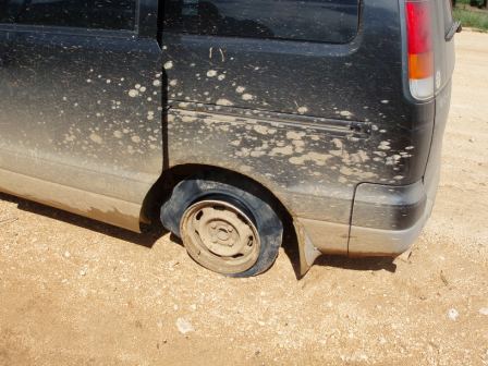 Schlaglöchern rechnen muss, gerade nach den heftigen Regenfällen der letzten Zeit. Wenn es eine „rough road“, also ein Sandpiste ist sind Schlaglöcher normal. Die Federn haben gehalten, aber wir hatten kurz vor dem Ziel einen Platten.
