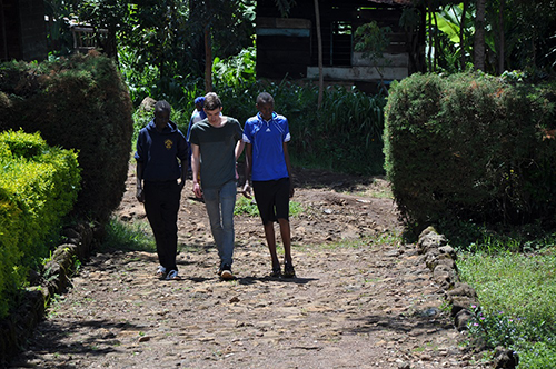 Am Nachmittag sind wir nach Rombo gefahren, was ca. 25 km entfernt ist. Die Fahrt dahin dauert wegen der schlechten Straße fast eine Stunde, einfach schnell mal so irgendwohin zu fahren muss gut überlegt werden, es ist immer wieder eine Herausforderung! Wir besuchen die Familie von Pfr. Juvenal, es ist eine gute Gelegenheit unseren afrikanischen „Neulingen“ Lore und Norberto das Leben in einer afrikanischen Familie zu zeigen. Die Familie lebt auf einem für die Kilimanjaro Gegend typischen Grundstück: inmitten von Bananen- und Kaffeestauden stehen die Häuser für die Familie und auch die Ställe für die Tiere. Ziegen, Hühner und Kühe leben Seite an Seite mit den 3 Generationen der Kimario-Sippe.